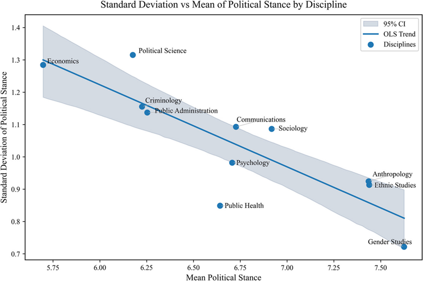A new peer-reviewed study published in Theory and Society analyzed roughly 600,000 social science abstracts published between 1960 and 2024 across 11 disciplines, 6 decades, and hundreds of journals. The findings are something many have pointed out over the years, because it’s plain to see. Approximately 90% of all politically relevant social science research leaned left, and the mean political stance of every single discipline was left-of-center every single year of the study period. Economics was the least skewed, with a mean score of 5.7 out of 10 on the left-right scale. Gender studies clocked in at 7.6. The ideological dial only turns one direction here.