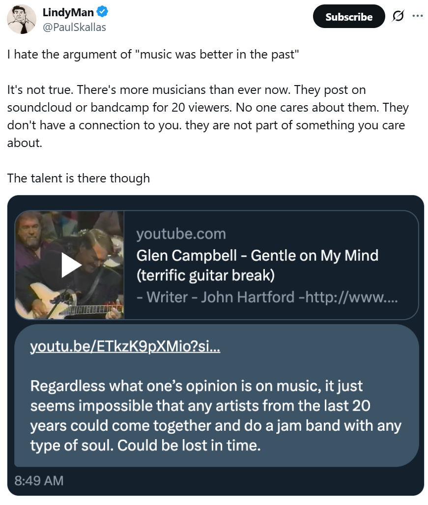 So if you want to find intelligent or creative work, look to the margins. The novel with just a few passionate positive reviews, the Substacks few people are quoting, the indie musician no one has heard of making 9 minute instrumental tracks that rival the classical greats. That’s where the edges still exist. That’s where people are making things for meaning instead of metrics.